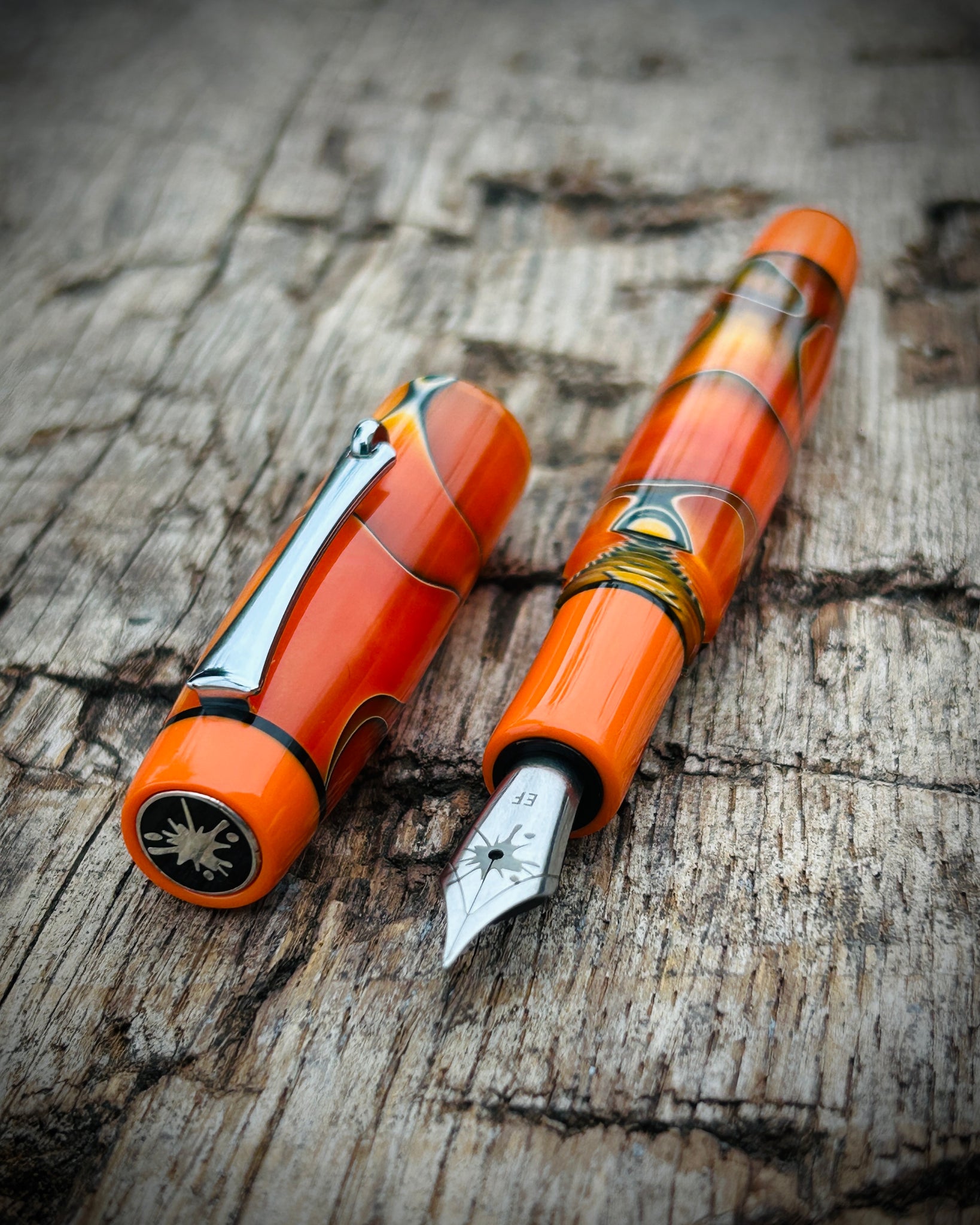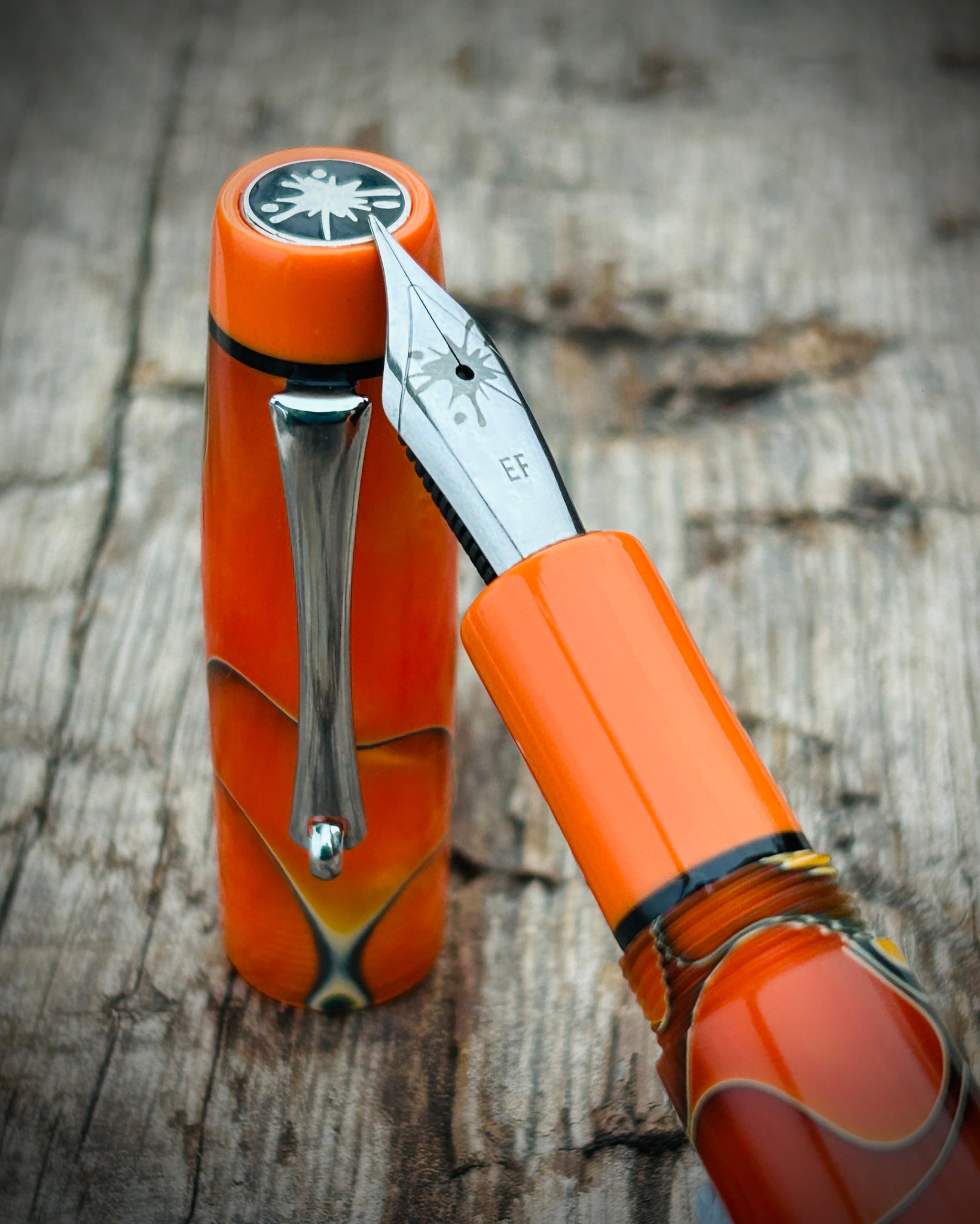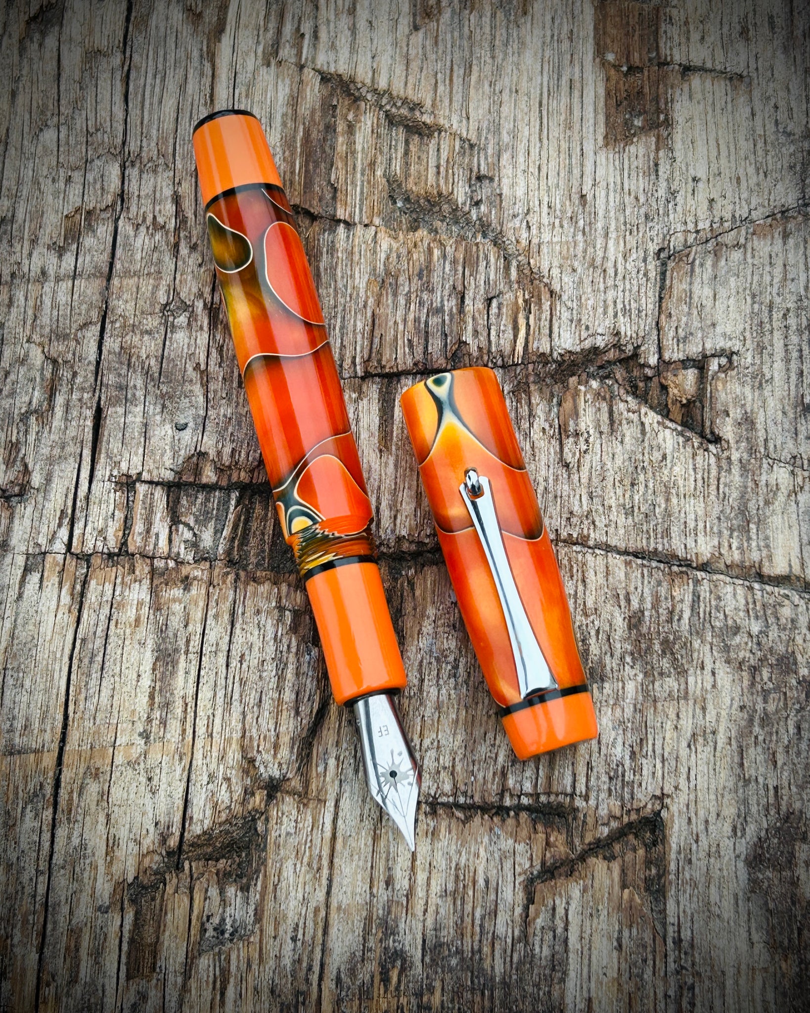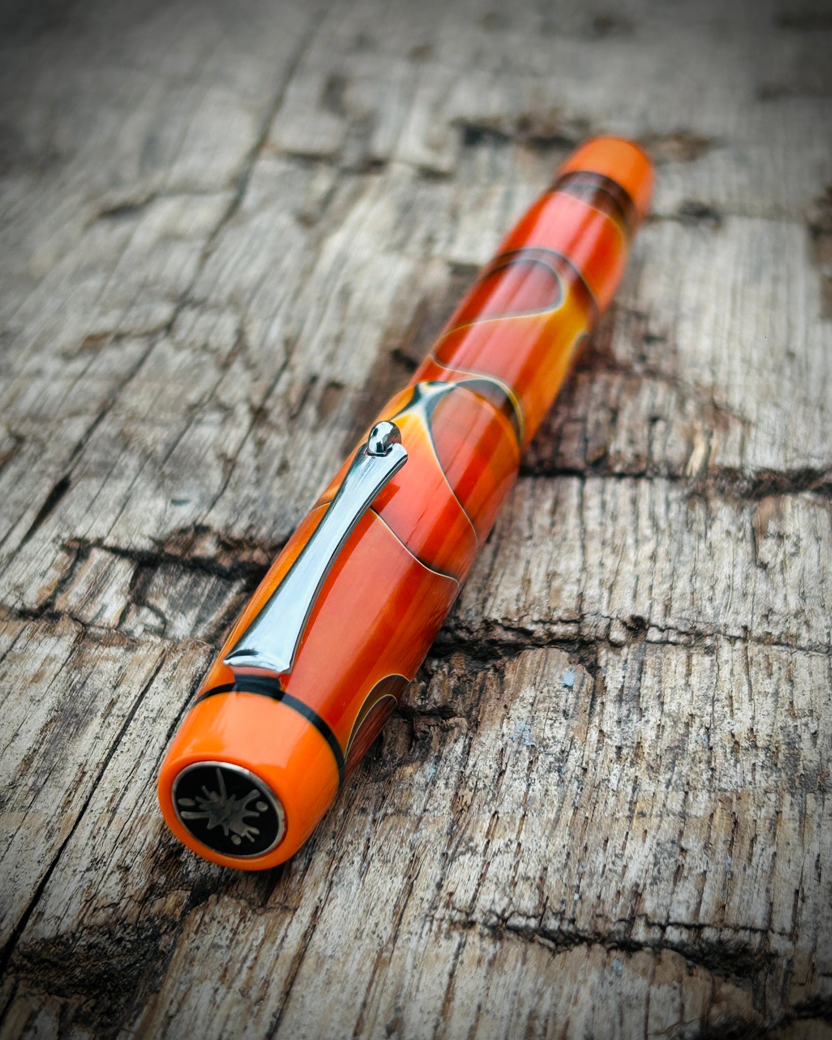 A Rascal model made from Nectarine acrylic. This is the Artisan version, featuring a pocket clip and three accent rings placed at the section, cap finial, and barrel finial. The Artisan is the most intricate of the Rascal styles, designed for those who appreciate craftsmanship in every detail.