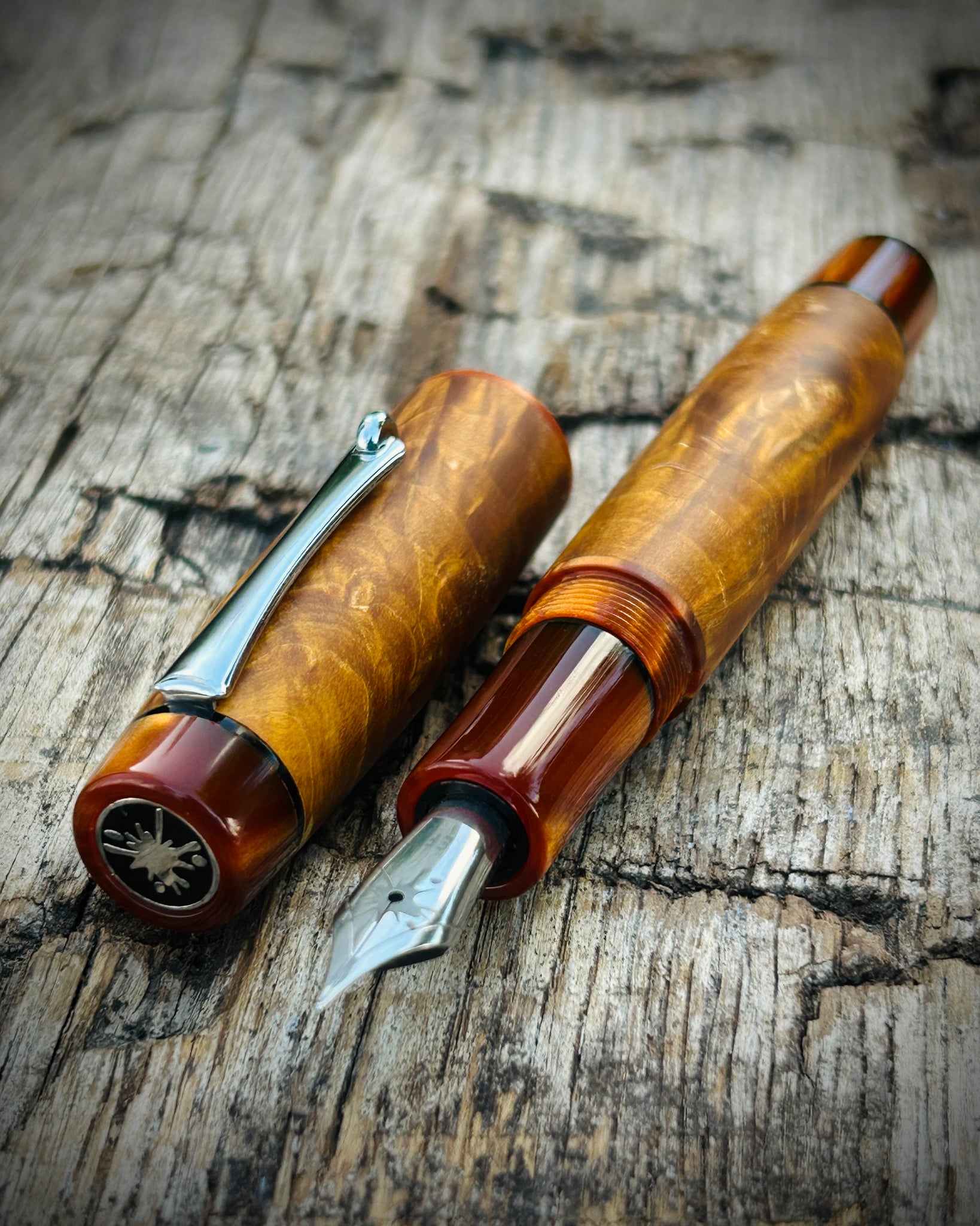 A Rascal model crafted from dyed and stabilised maple burr. This is the Artisan version, featuring a pocket clip and three accent rings — placed at the section, cap finial, and barrel finial. It also features a two-tone barrel finial. The Artisan is the most intricate of the Rascal styles, designed for those who appreciate craftsmanship in every element.