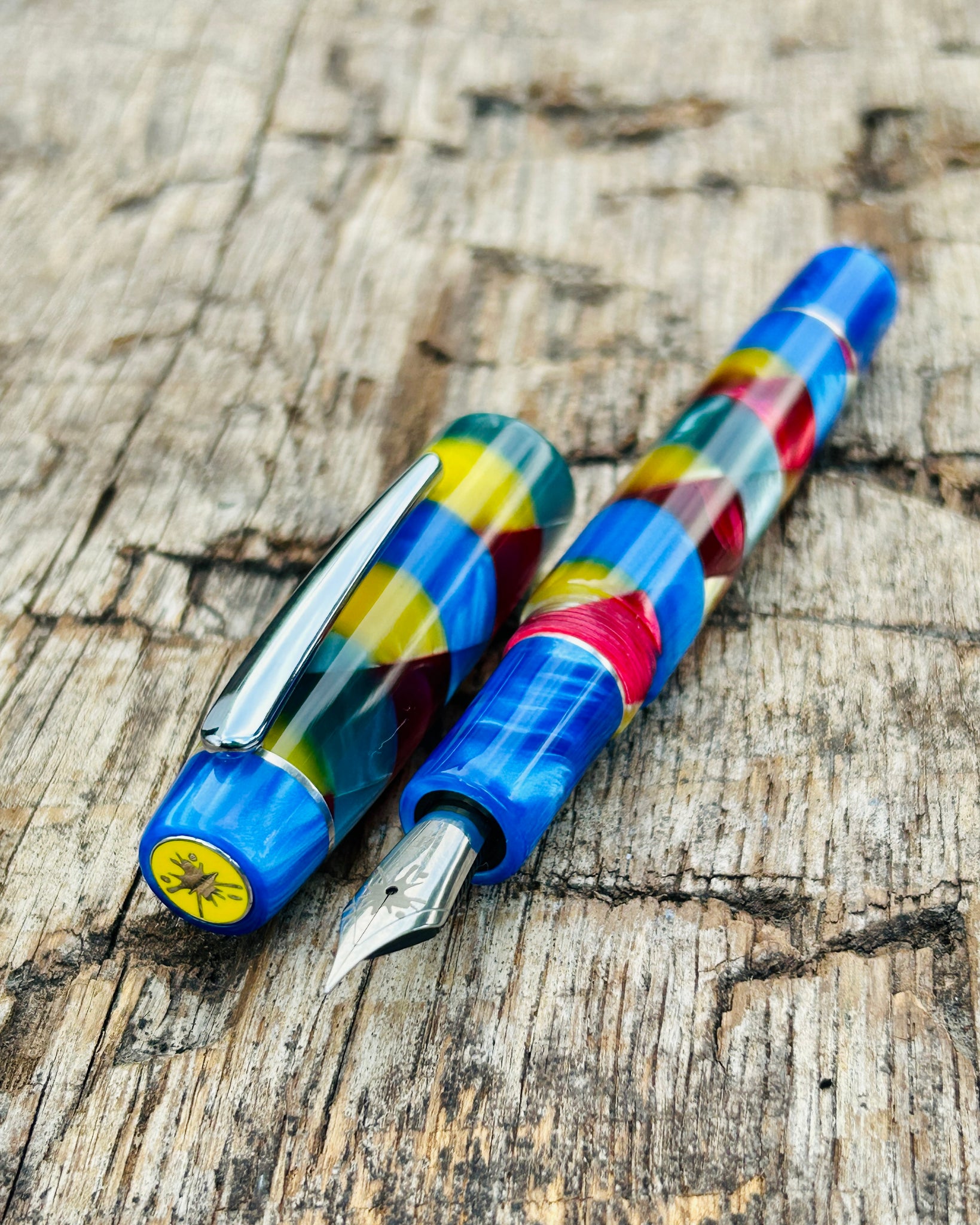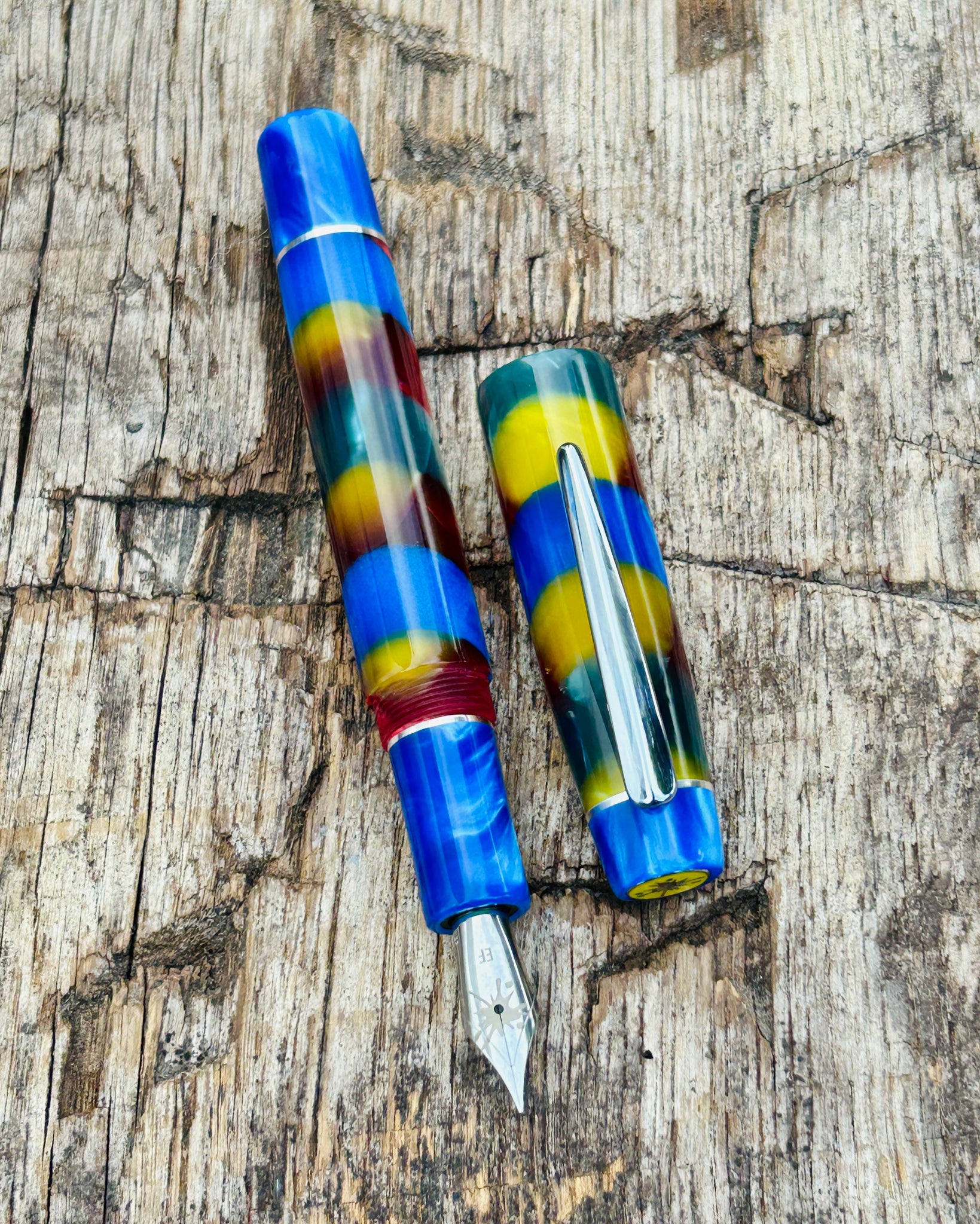 A DayDreamer in Harlequin and Blue Pearl acrylic with sterling silver accent rings. This is the Artisan version, featuring a pocket clip and three accent rings - one at the section, one at the cap finial and one at the barrel finial. It is the most detailed and luxurious of the styles available. Perfect for those who appreciate craftsmanship in every element.