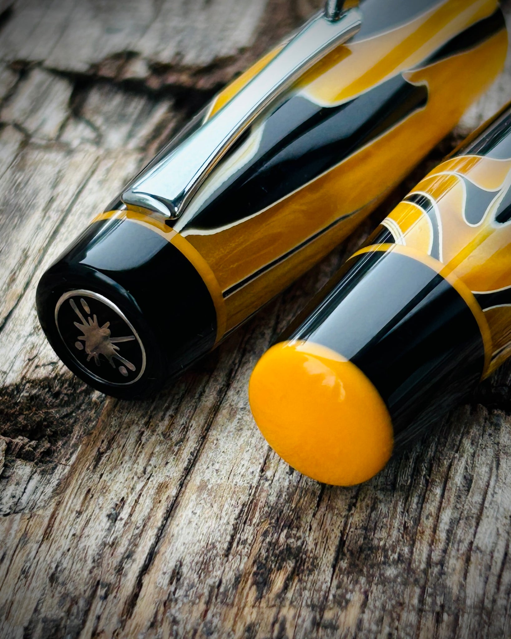A Rascal model crafted from Bengal Tiger acrylic. This is the Artisan version, featuring a pocket clip and three accent rings - placed at the section, cap finial, and barrel finial. The Artisan is the most intricate of the Rascal styles, designed for those who appreciate craftsmanship in every element.