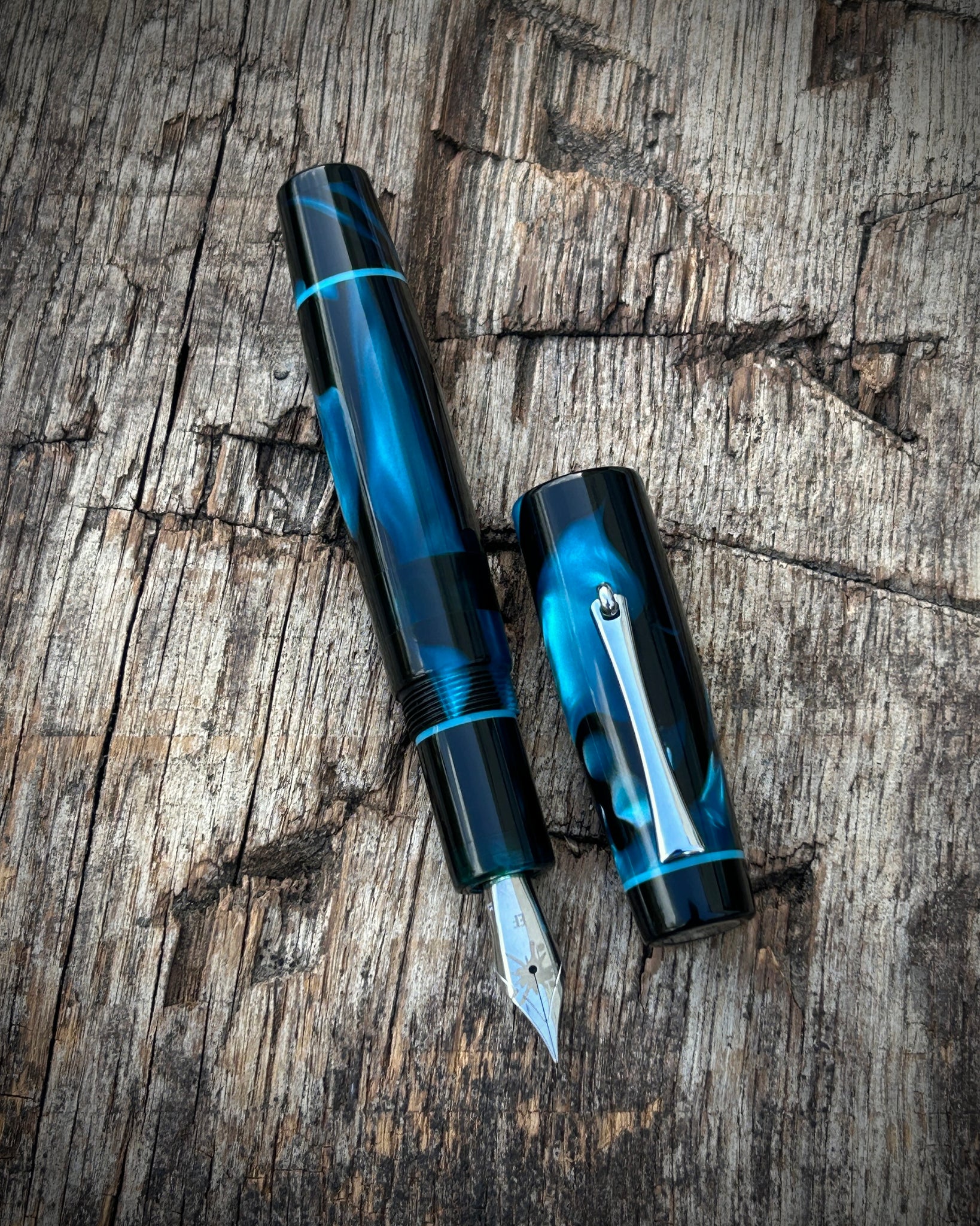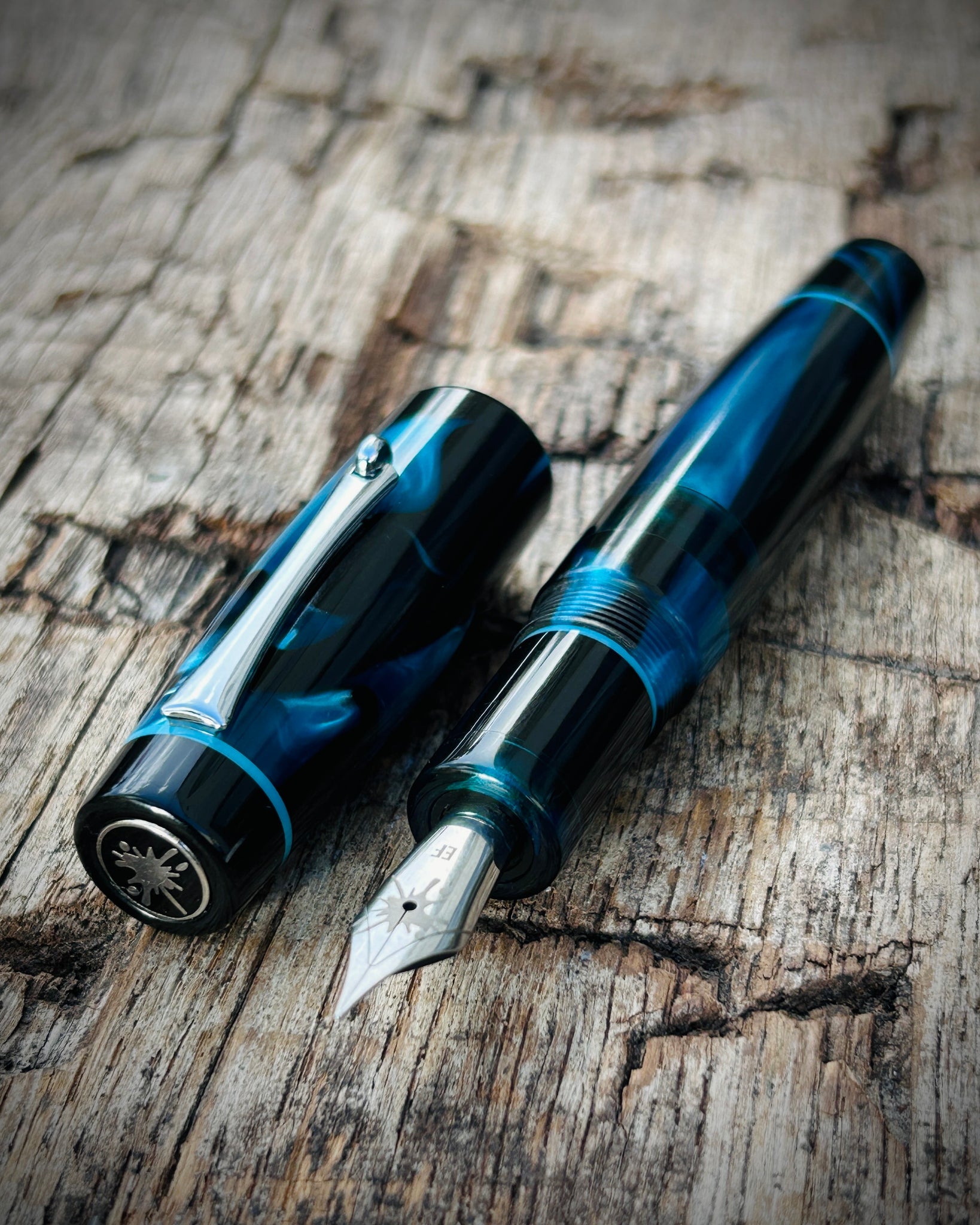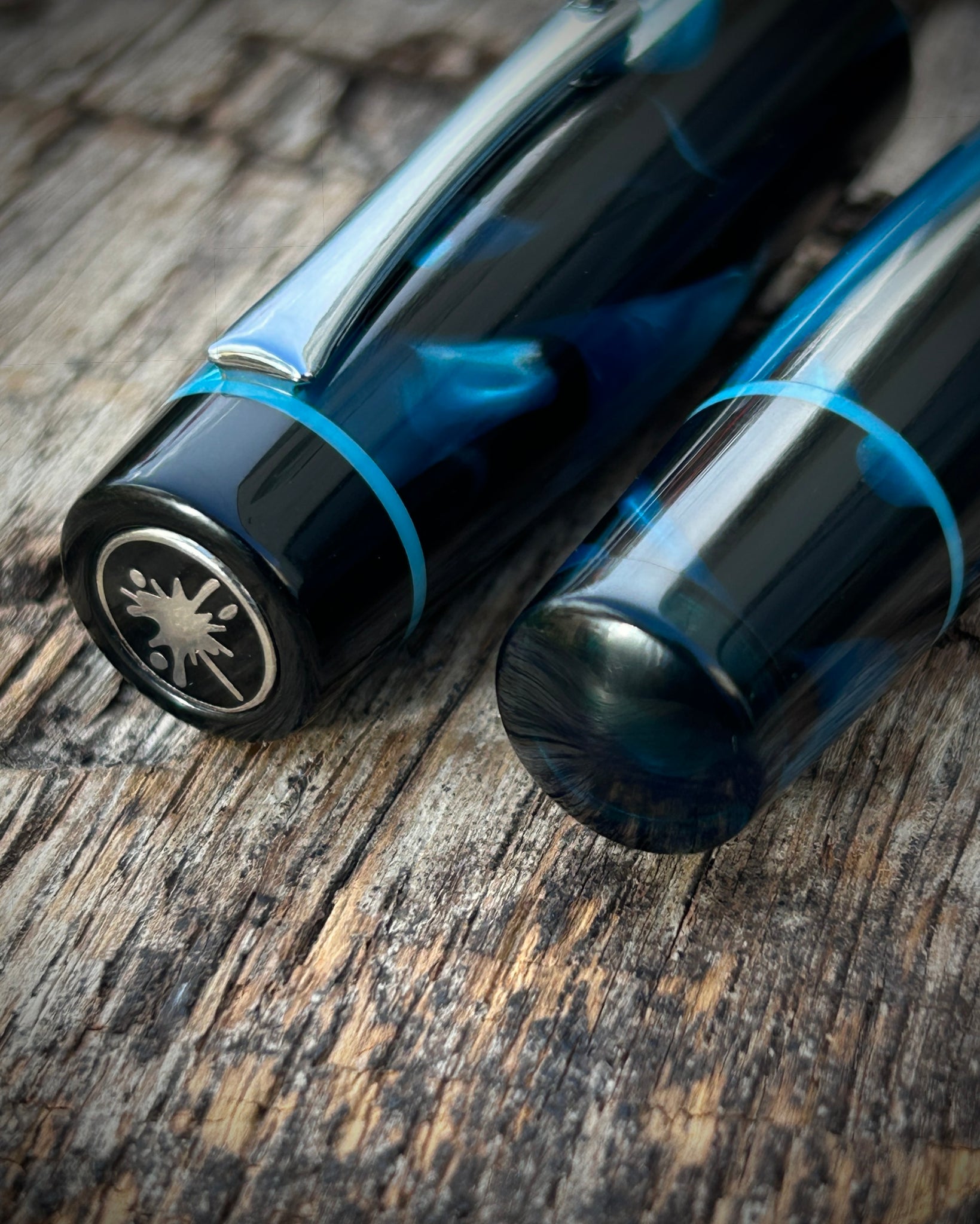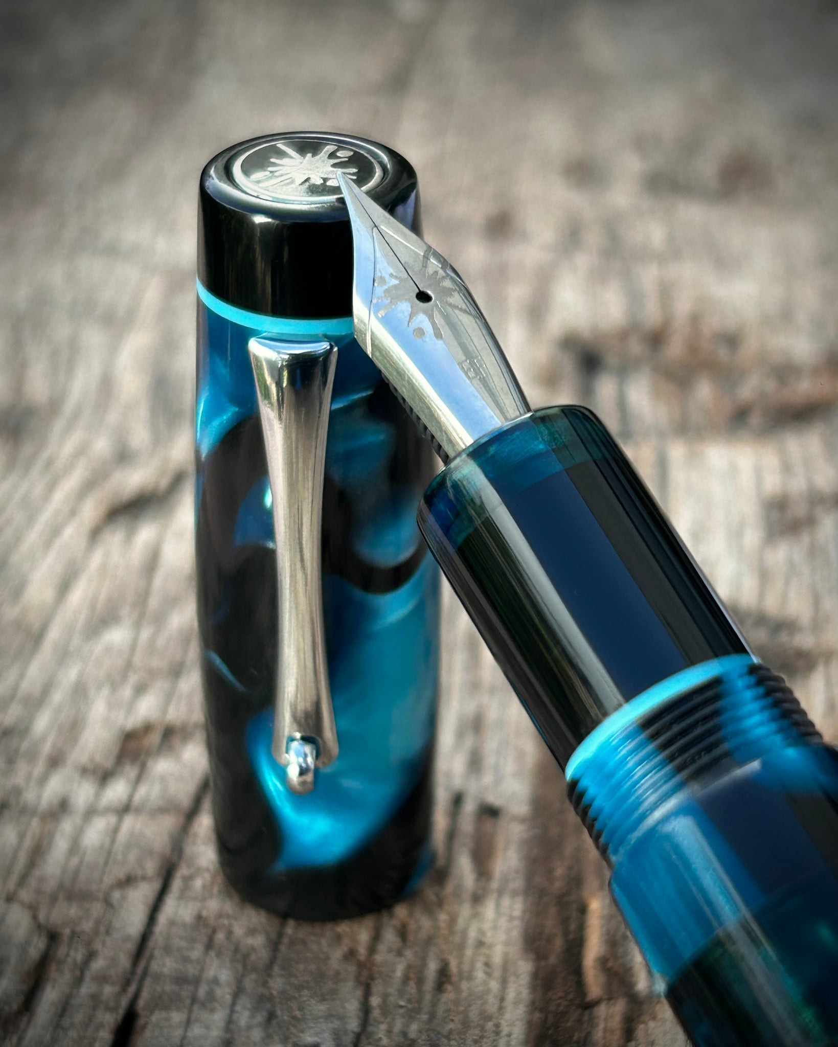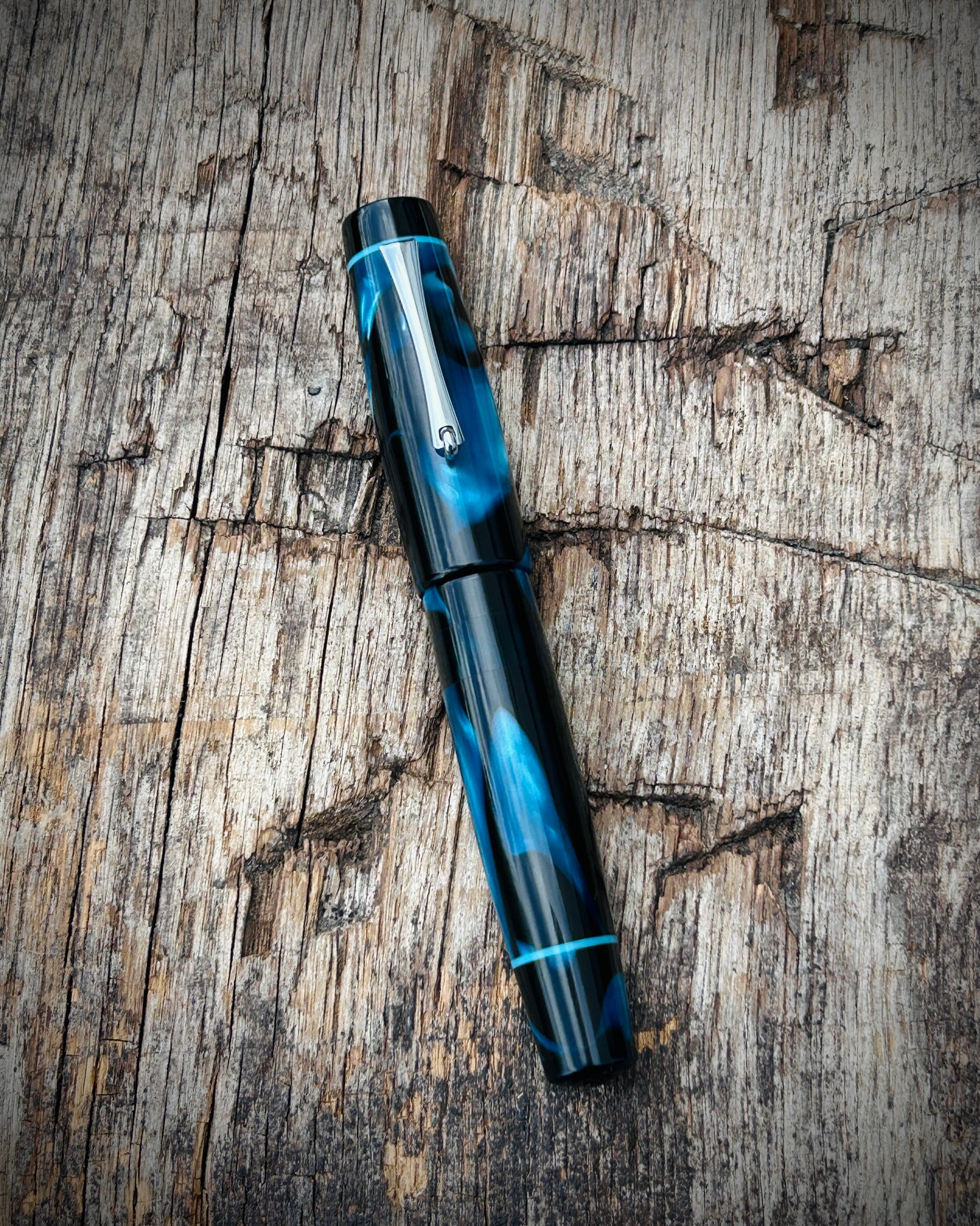 A Rascal model crafted from Moon Pool acrylic. This is the Artisan version, featuring a pocket clip and three accent rings placed at the section, cap finial, and barrel finial. The Artisan is the most intricate of the Rascal styles, designed for those who appreciate craftsmanship in every element.