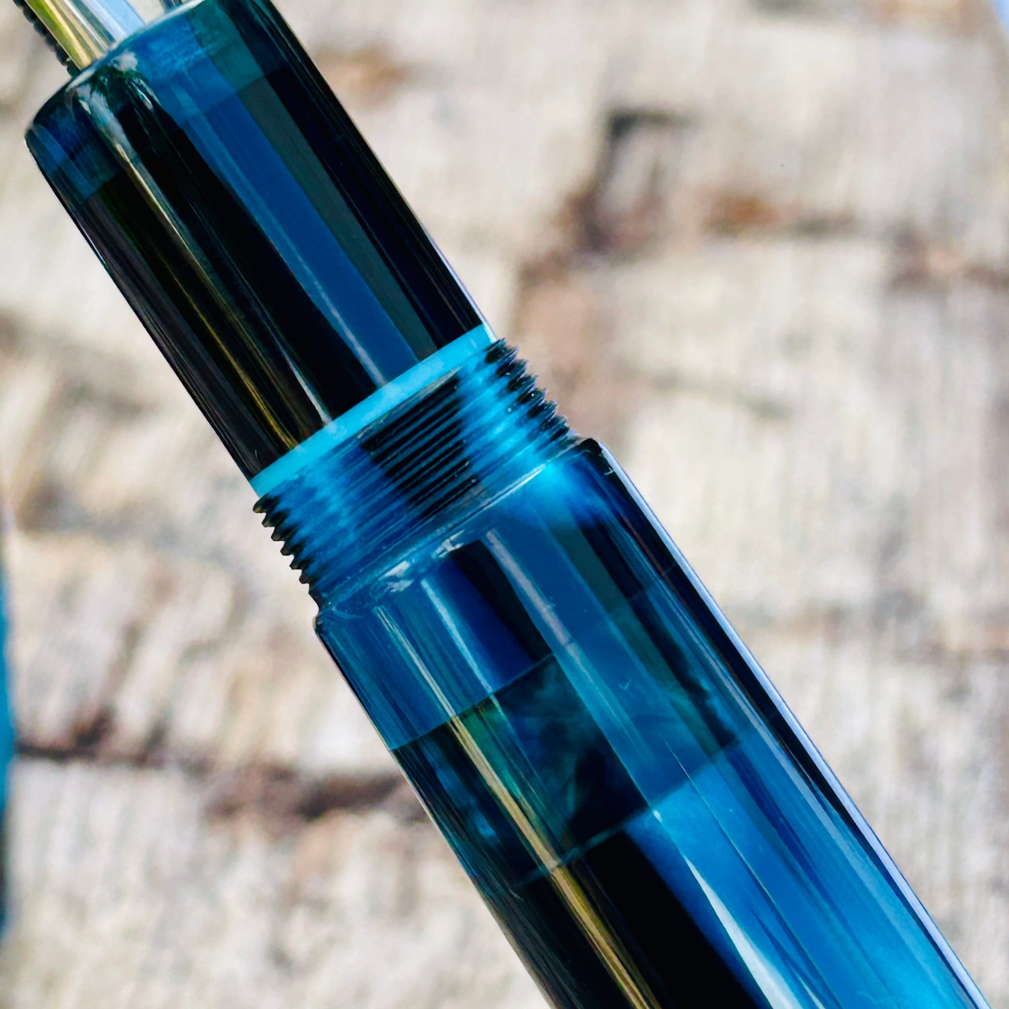 This pen also introduces a subtle integrated ink window positioned just behind the cap threads. The lightly translucent teal aRea blends into the barrel when viewed normally, but reveals the ink level when held to the light. Positioned so the window begins where the converter barrel starts, it allows you to see the ink levels rather than the internal section threads and hardware, keeping the appearance clean and integrated.