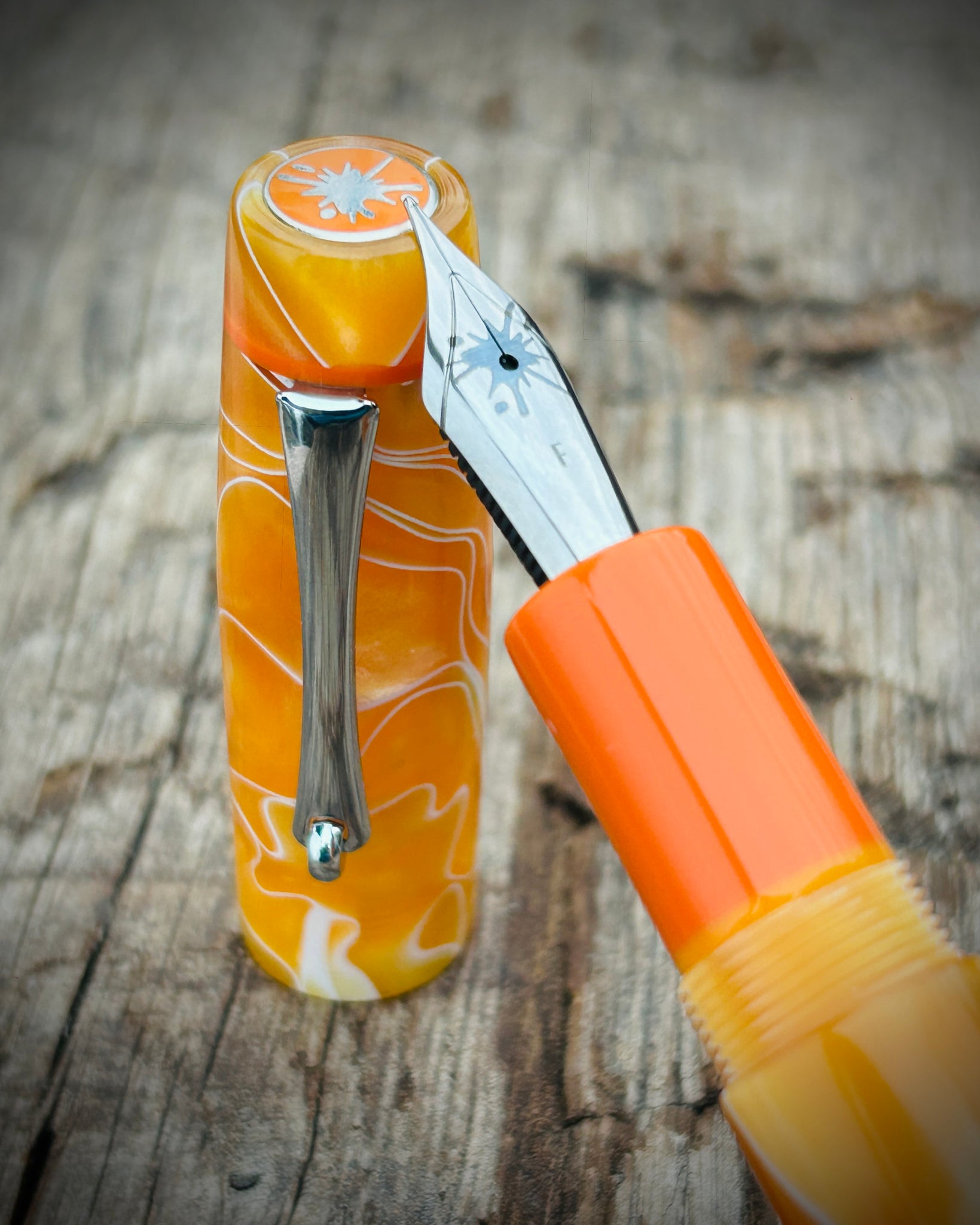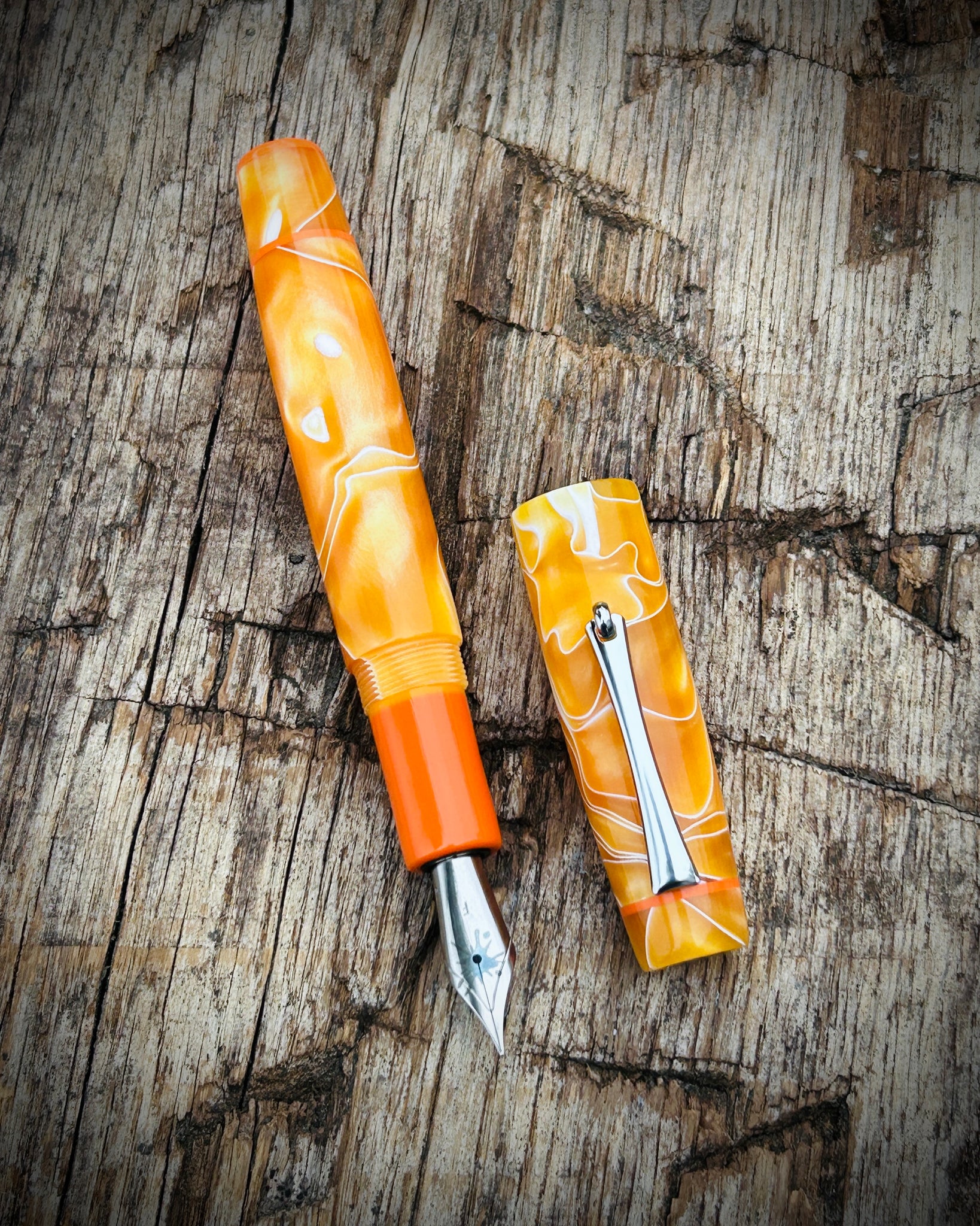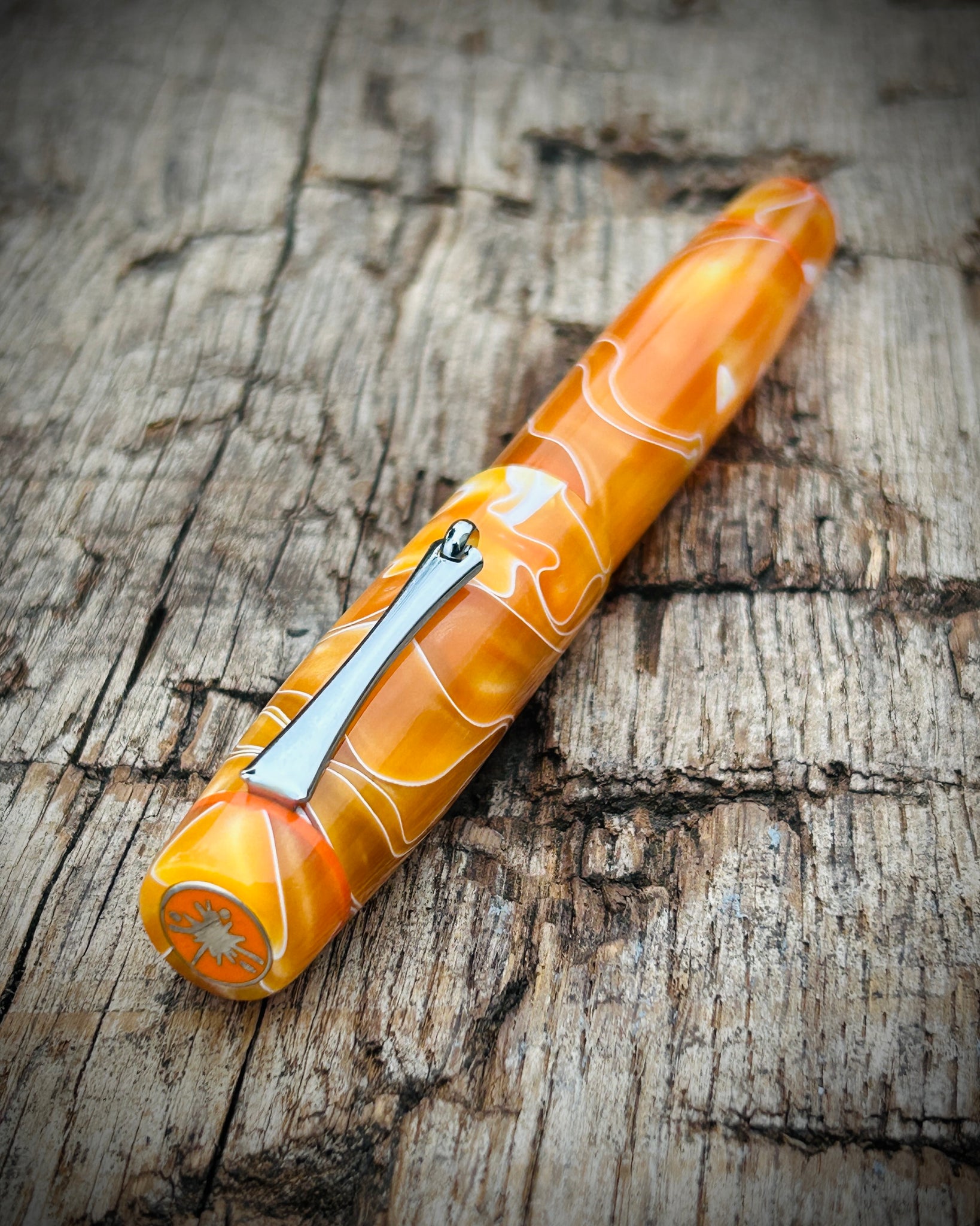 A Rascal model crafted from Satsuma acrylic. This is the Artisan version, featuring a pocket clip and three accent rings - placed at the section, cap finial, and barrel finial. The Artisan is the most intricate of the Rascal styles, designed for those who appreciate craftsmanship in every element.