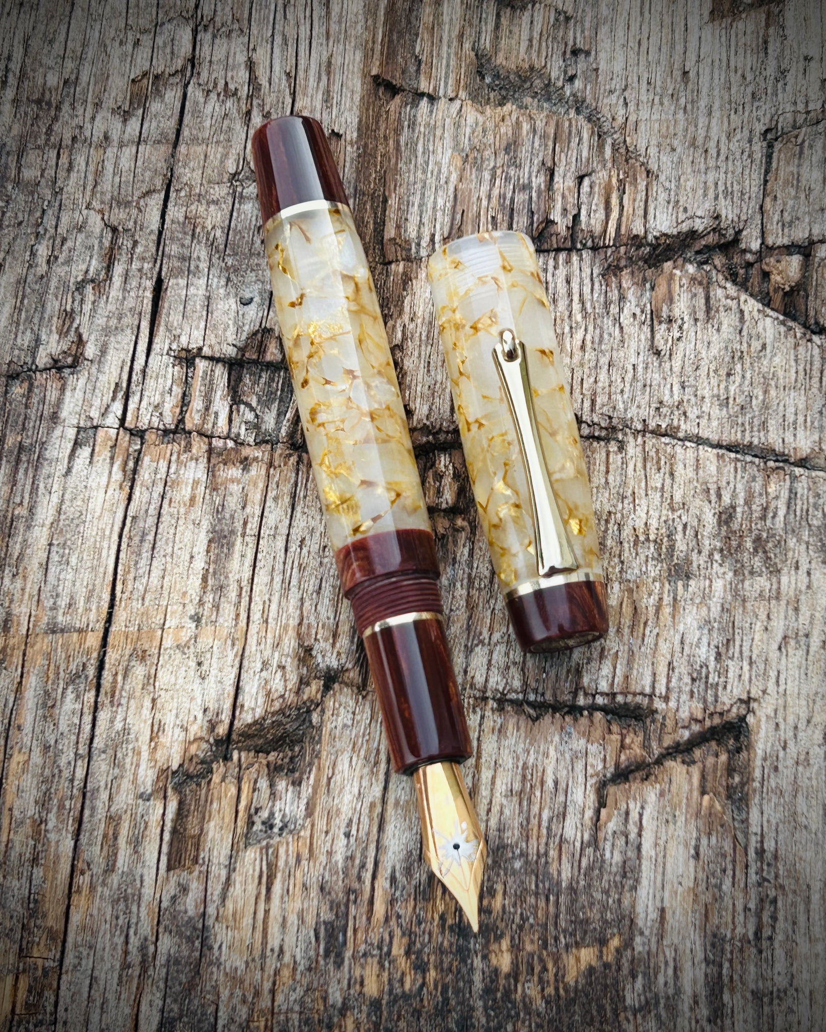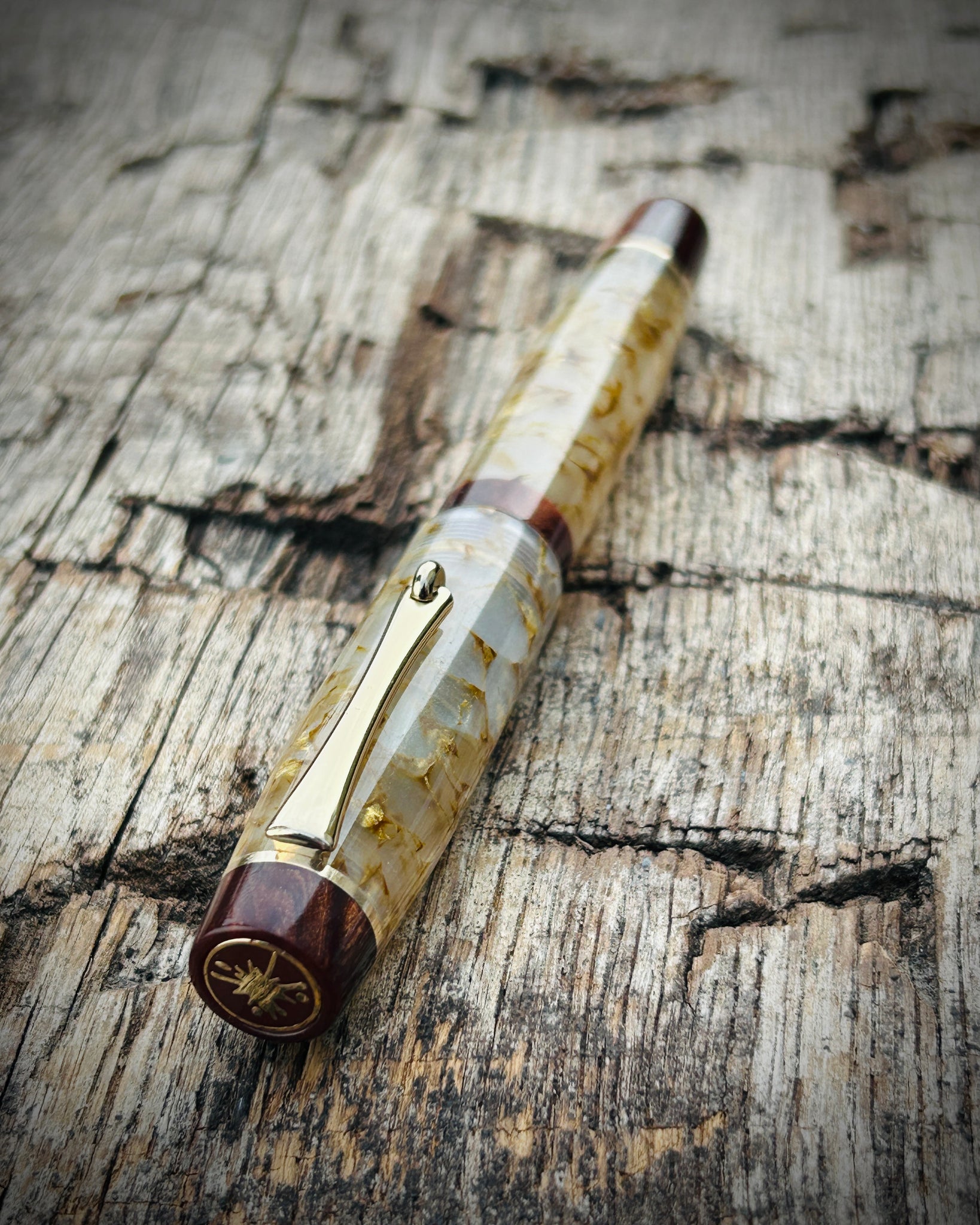 A Rascal model made from Gold Fleck & Brown acrylic with gold coloured accents. This is the Artisan version, featuring a pocket clip and three accent rings placed at the section, cap finial, and barrel finial.