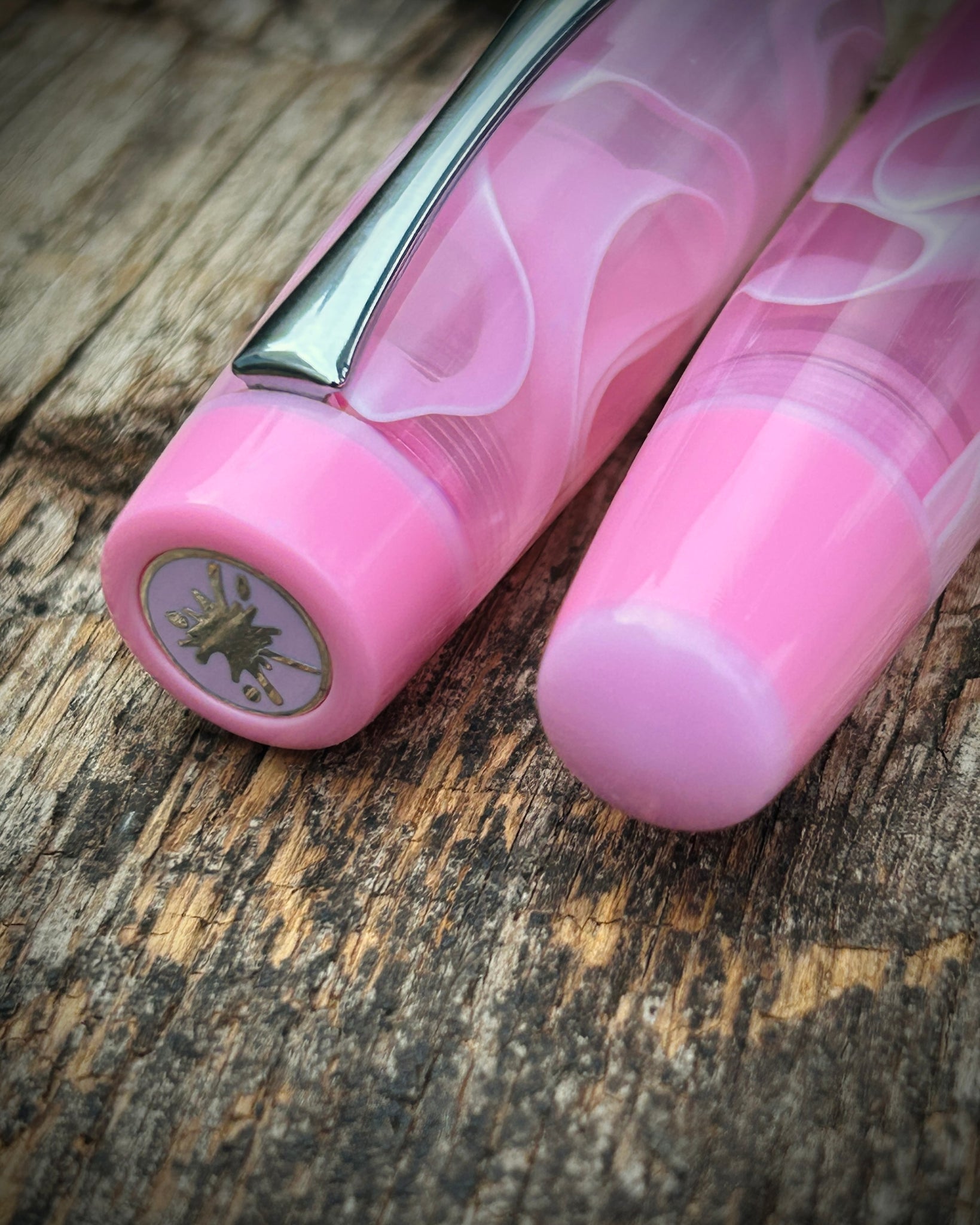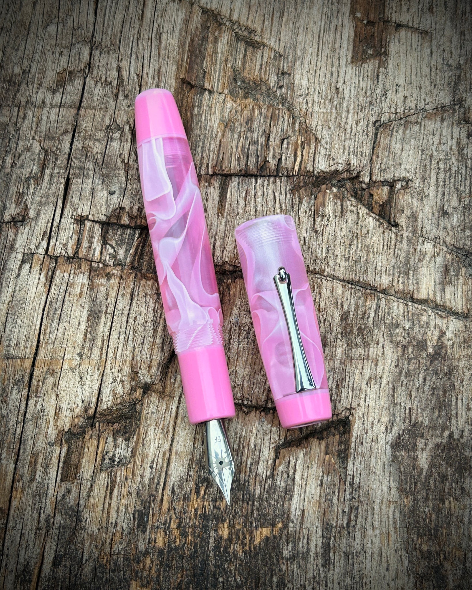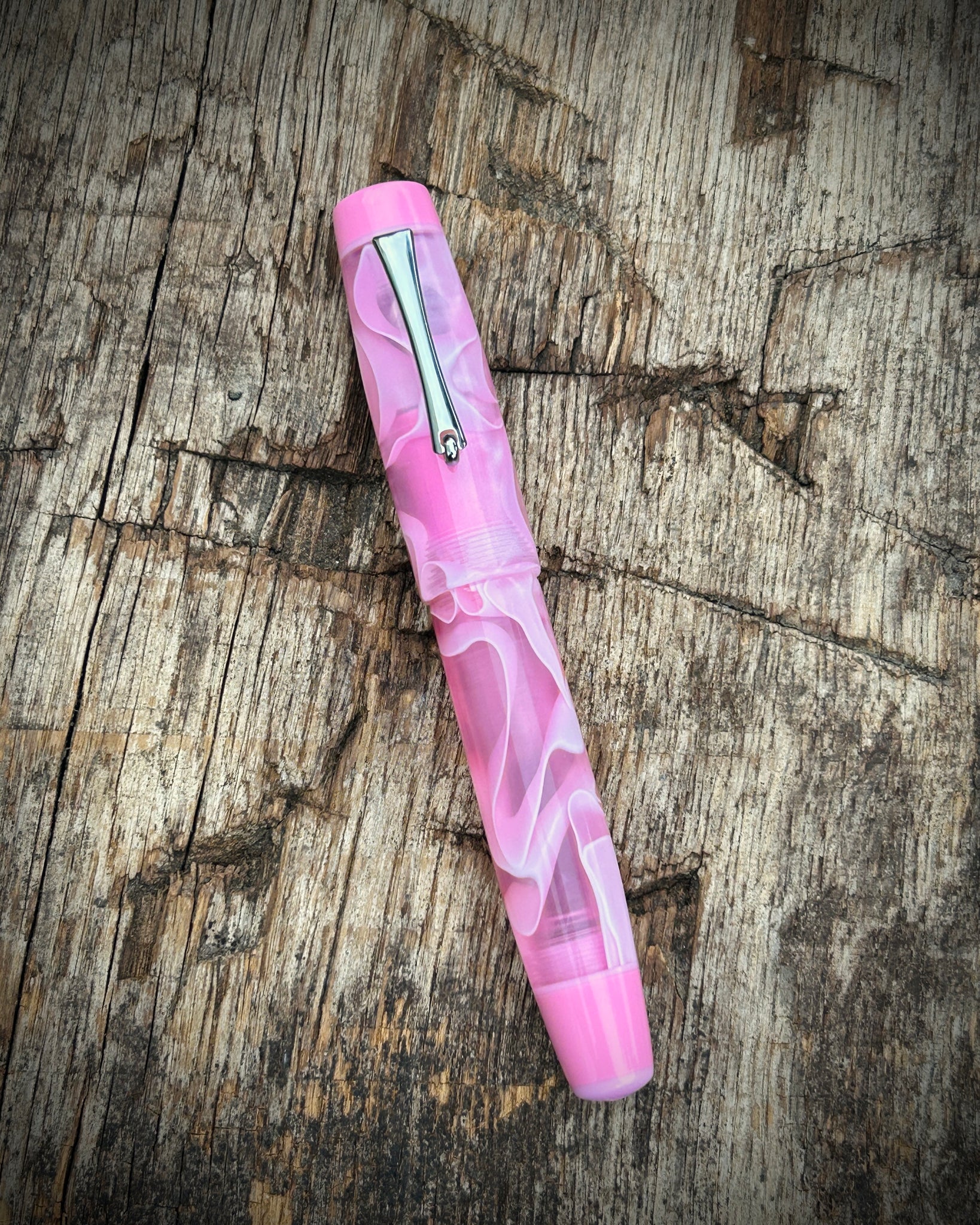 A Rascal model crafted from candy floss acrylic. This is the Artisan version, featuring a pocket clip and three accent rings - placed at the section, cap finial, and barrel finial. The Artisan is the most intricate of the Rascal styles, designed for those who appreciate craftsmanship in every element.