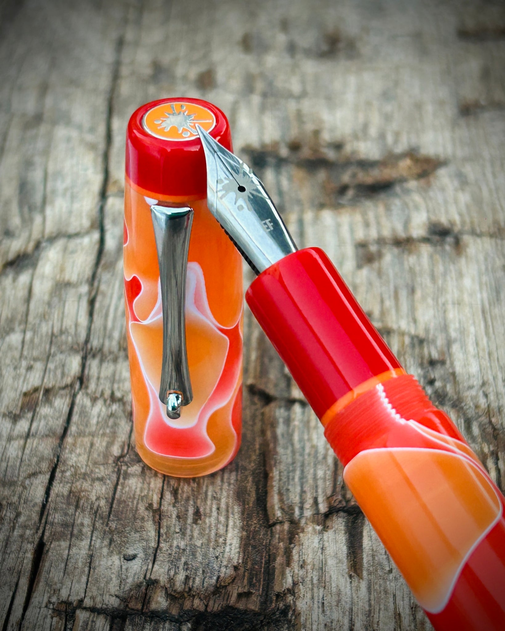A Rascal model crafted from Fire Coral acrylic. This is the Artisan version, featuring a pocket clip and three accent rings - placed at the section, cap finial, and barrel finial. The Artisan is the most intricate of the Rascal styles, designed for those who appreciate craftsmanship in every element.